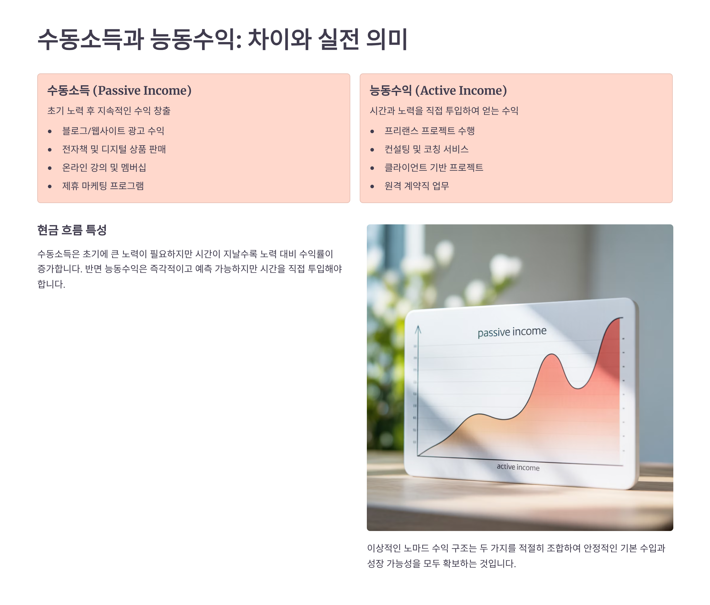 수익 구분을 할 때는 각 수익원의 확장 가능성도 고려해야 해요. 예를 들어 1:1 컨설팅(능동)을 그룹 코칭(반수동)으로, 그룹 코칭을 온라인 코스(수동)로 발전시킬 수 있어요. 이런 식으로 능동수익을 점진적으로 수동화하는 전략이 지속가능한 노마드 비즈니스의 핵심이에요! 💡