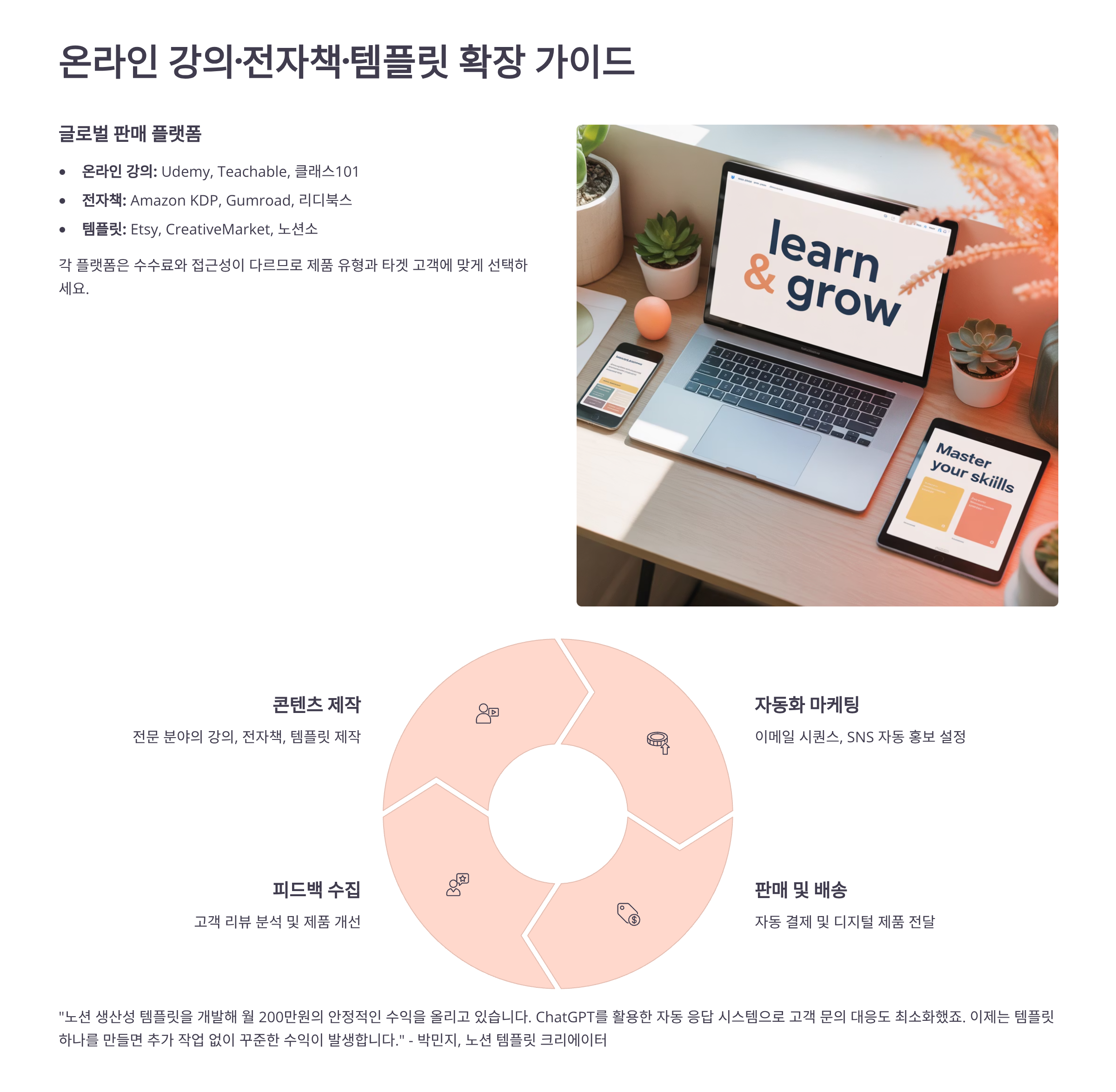 확장 전략의 핵심은 하나의 콘텐츠를 여러 형태로 재활용하는 거예요. 예를 들어, 하나의 주제로 먼저 블로그 포스트를 작성하고, 이를 확장해서 전자책을 만들고, 전자책 내용을 바탕으로 온라인 강의를 제작하고, 강의에서 사용한 자료를 템플릿으로 판매하는 식이죠. 이렇게 하면 콘텐츠 제작 효율성이 극대화돼요.