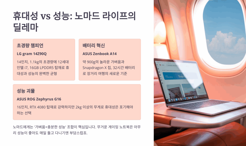 노마드 생활은 자유롭고 창의적인 삶의 방식이에요. 좋은 노트북은 이런 라이프스타일을 더욱 풍요롭게 만들어줄 거예요. 세계 어디서든 최고의 퍼포먼스를 발휘할 수 있는 나만의 완벽한 파트너를 찾으시길 바라요! 🌍💻✈️