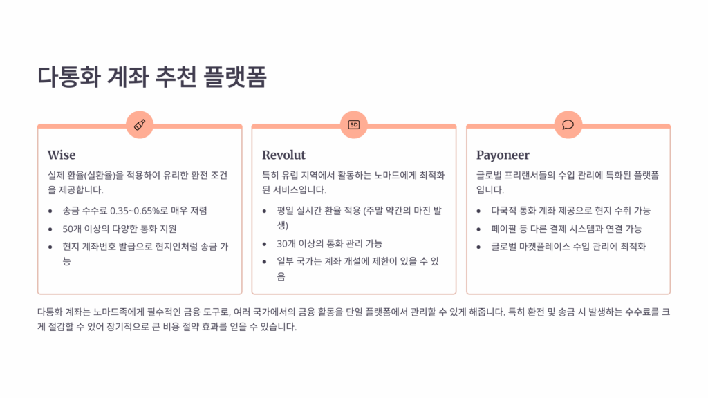 나의 생각했을 때 다통화 계좌는 최소 2개 이상 운영하는 게 좋아요. 메인으로 Wise, 서브로 Revolut이나 Payoneer를 추천해요. 각 플랫폼마다 장단점이 있으니 본인의 상황에 맞게 선택하세요. 저는 현재 4개의 다통화 계좌를 운영하면서 상황에 따라 유연하게 활용하고 있답니다! 💼