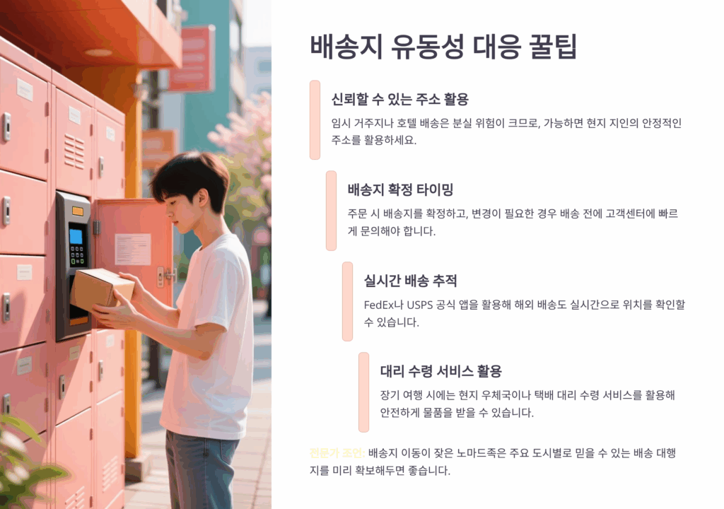 A3. 배송 대행 서비스의 가상 주소를 이용하거나, 아마존 로커 같은 픽업 서비스를 활용하는 것이 좋아요. 미리 다음 목적지 주소를 확보해두는 것도 중요해요.