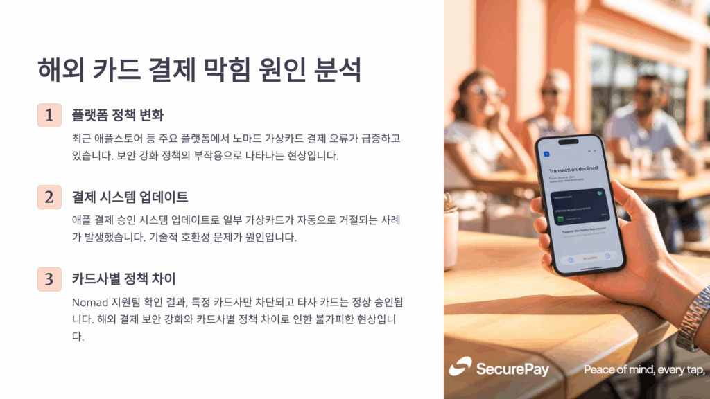 네 번째 원인은 카드 유효기간 만료나 재발급으로 인한 카드번호 변경이에요. 해외에 있으면 새 카드를 받기 어려워서 이런 문제가 생기면 정말 난감하죠. 다섯 번째는 환율 변동으로 인한 결제 금액 차이 문제예요. 원화 결제인데도 해외에서 시도하면 환전 과정을 거치면서 오류가 발생할 수 있어요.