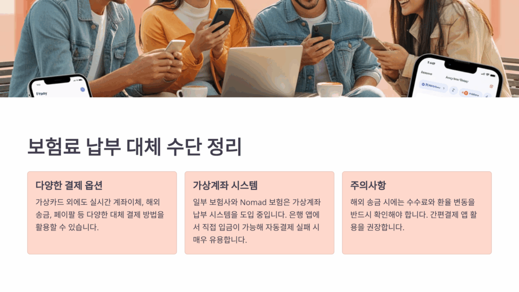 두 번째 대안은 가족이나 지인을 통한 대납이에요. 한국에 있는 가족에게 부탁해서 대신 납부하게 하는 방법인데요, 보험사에 미리 대납자 등록을 해두면 더욱 편리해요. 매달 가족에게 송금해주고 대신 내달라고 부탁하는 방식으로 많은 노마드들이 활용하고 있답니다.