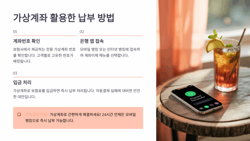 가상계좌를 활용한 스마트한 팁도 있어요. 매달 납부일을 잊지 않기 위해 스마트폰에 알람을 설정해두세요. 그리고 3개월이나 6개월치를 한 번에 선납하는 방법도 있어요. 이렇게 하면 매달 송금하는 번거로움을 줄일 수 있고, 일부 보험사는 선납 할인 혜택도 제공한답니다.