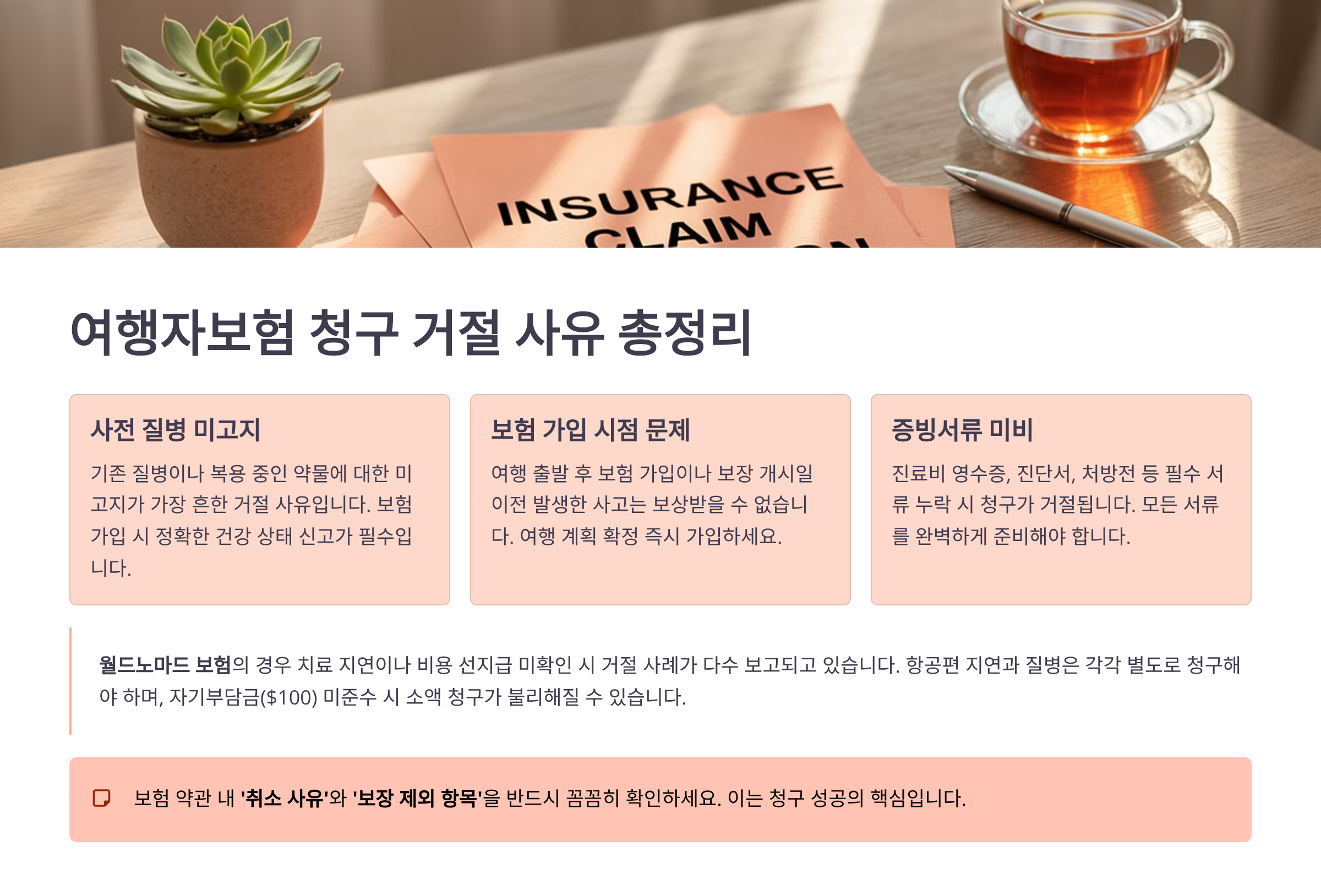 여행자보험 청구가 거절되는 상황은 정말 당황스럽고 막막해요. 특히 노마드로 장기간 해외에 체류하면서 의료비를 지출했는데 보험금을 받지 못한다면 경제적 부담이 클 수밖에 없죠. 하지만 미리 준비하고 제대로 알고 있다면 충분히 피할 수 있어요!