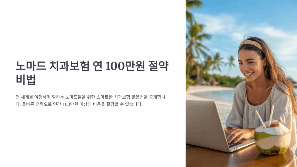 디지털 노마드로 살면서 치과보험료를 연 100만원 이상 절약할 수 있는 실전 방법들을 공유해드릴게요. 전 세계를 여행하며 일하는 노마드들에게 치과 치료는 예상치 못한 큰 지출이 될 수 있어요. 하지만 똑똑한 전략으로 보험료를 대폭 줄이면서도 양질의 치과 치료를 받을 수 있답니다!