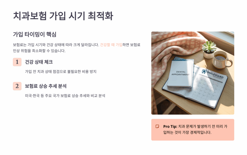 치과 치료 계획이 있다면 최소 3개월 전에는 가입하세요. 대부분의 치과보험이 가입 후 3~6개월의 대기기간을 두고 있어요. 임플란트나 크라운 같은 고가 치료는 12개월 대기기간이 적용되는 경우도 있으니, 미리미리 준비하는 게 중요해요. 급하게 치료받아야 할 상황에서 보험 혜택을 못 받는 것만큼 억울한 일은 없잖아요!