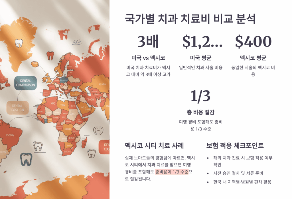 전 세계를 돌아다니는 노마드라면 국가별 치과 치료비 차이를 반드시 알아두세요. 같은 임플란트 시술이 미국에서는 500만원, 태국에서는 100만원, 멕시코에서는 80만원 정도예요. 이런 가격 차이를 활용하면 치료비와 여행을 동시에 해결할 수 있답니다!