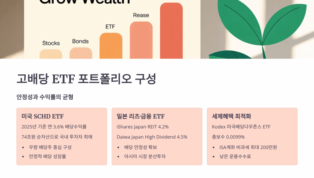 고배당 ETF 포트폴리오의 핵심은 안정성과 수익률의 균형이에요. 미국의 SCHD(슈왑 US 배당 주식 ETF)는 연 3-4%의 안정적인 배당을 제공하면서도 주가 상승까지 기대할 수 있어요. 국내에서는 KODEX 고배당이나 TIGER 배당성장 같은 ETF가 대표적이죠.