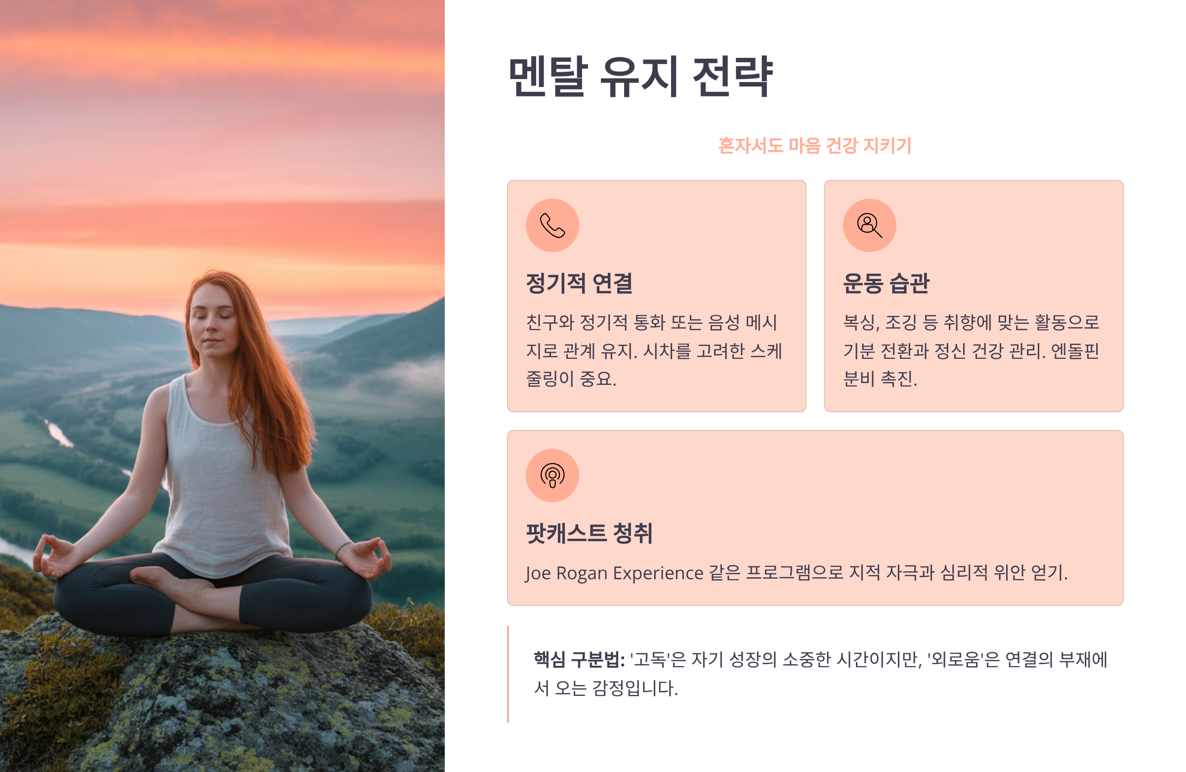 | 고립감 | 하루 종일 말 한마디 안 함 | 의도적인 사회 활동 시작 |