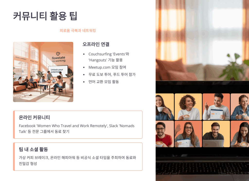 A2. 많은 노마드들이 코워킹 스페이스를 통해 커뮤니티를 찾았어요. 단순히 일하는 공간을 넘어서 네트워킹 이벤트, 워크샵, 소셜 활동을 제공하기 때문이죠. 특히 정기 멤버십을 구매하면 같은 사람들을 자주 만나게 되어 자연스럽게 친해질 수 있어요.