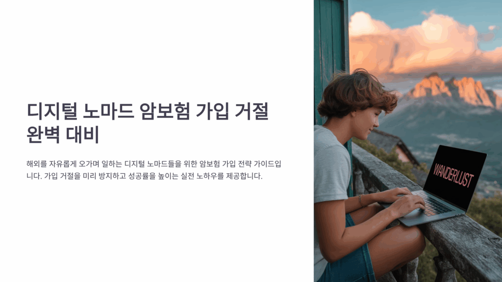 디지털 노마드로 살아가는 분들에게 암보험 가입은 정말 중요한 문제예요. 해외 거주 중에도 건강 보장을 받을 수 있는 암보험은 필수적인데, 가입 거절을 당하는 경우가 많아서 고민이 많으시죠? 오늘은 암보험 가입 거절을 완벽하게 대비하는 방법을 상세히 알려드릴게요! 😊