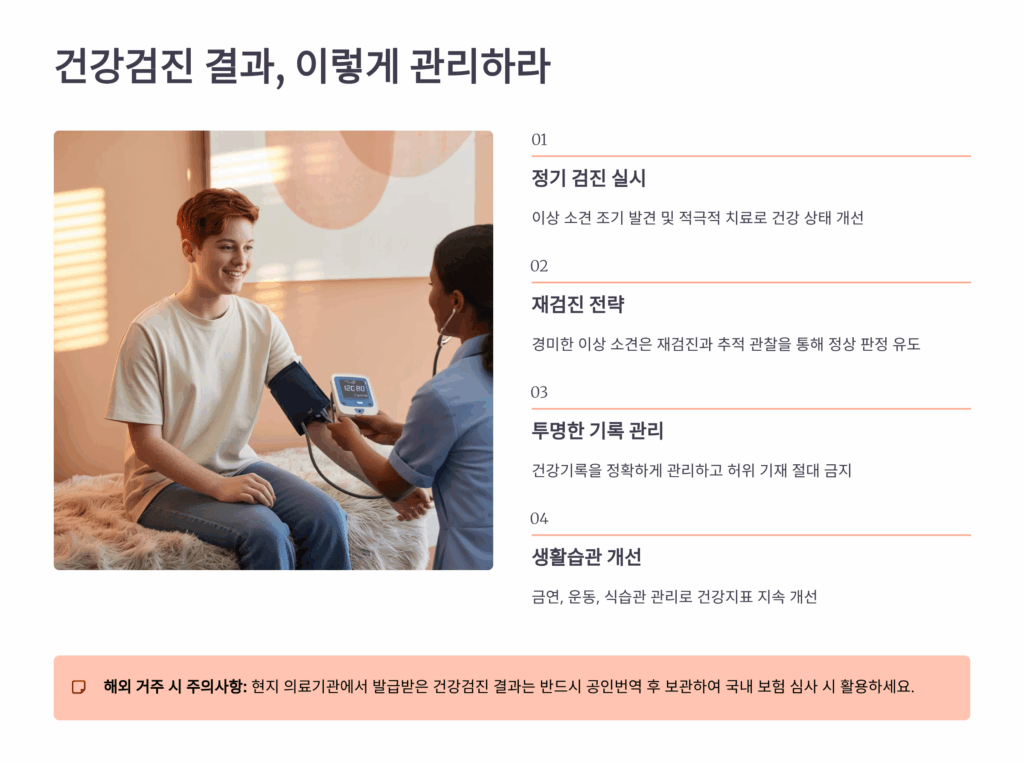 검진 결과에 이상이 있었다면 즉시 전문의 상담을 받아 치료나 관리를 시작하세요. 단순한 수치 이상이라면 3-6개월의 생활습관 개선으로 정상화될 수 있어요. 이후 재검진을 받아 정상 판정을 받은 후 보험 가입을 신청하면 승인 가능성이 높아져요. 검진 기관 선택도 신중하게 하세요. 대학병원이나 종합병원의 검진 결과가 보험사에서 더 신뢰받는 경향이 있답니다! 🏥