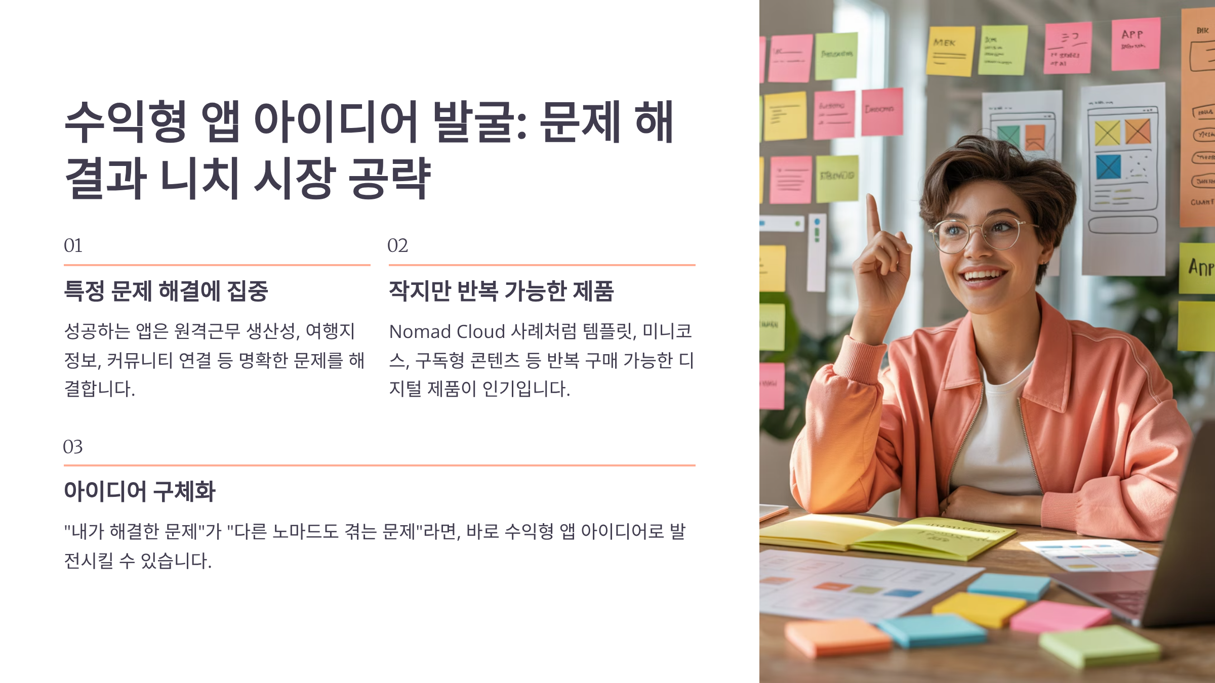 아이디어 발굴의 첫 번째 단계는 자신의 경험에서 출발하는 거예요. 여러분이 디지털 노마드로 살면서 겪었던 불편함이나 필요했던 도구들을 떠올려 보세요. ‘비행기에서 시차 적응을 돕는 앱’, ‘다국가 세금 계산 앱’, ‘노마드를 위한 코워킹 스페이스 찾기 앱’ 같은 것들이 실제로 좋은 사례가 될 수 있어요. 내가 생각했을 때 가장 성공 확률이 높은 앱은 개발자 본인이 첫 번째 사용자가 되는 앱이에요. 그래야 진짜 문제를 해결할 수 있거든요.