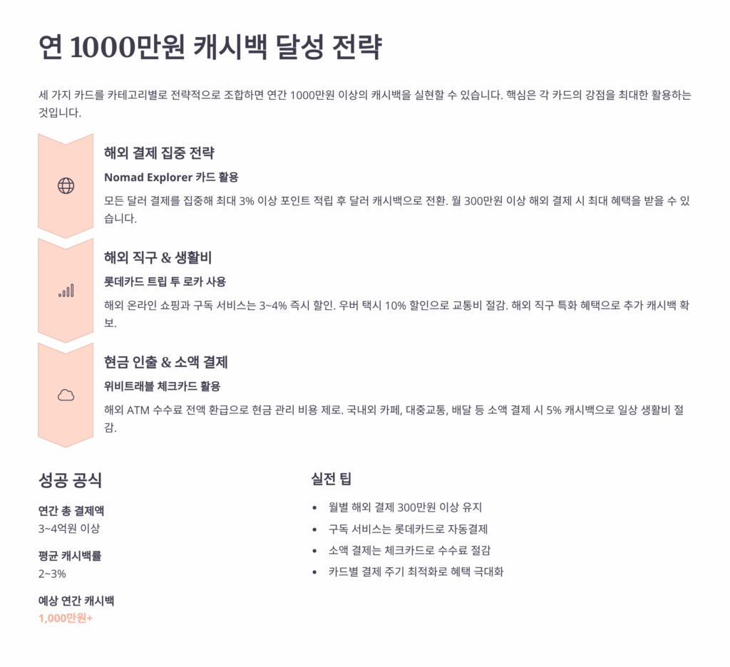 해외 결제 캐시백 3-5%만 잘 챙겨도 월 수십만 원이 돌아오고, 환전 수수료 0% 카드로 연간 90만원을 절약하고, ATM 수수료 면제로 추가 30만원을 아낄 수 있어요. 여기에 마일리지까지 모으면 무료 항공권으로 여행 경비까지 줄일 수 있죠!