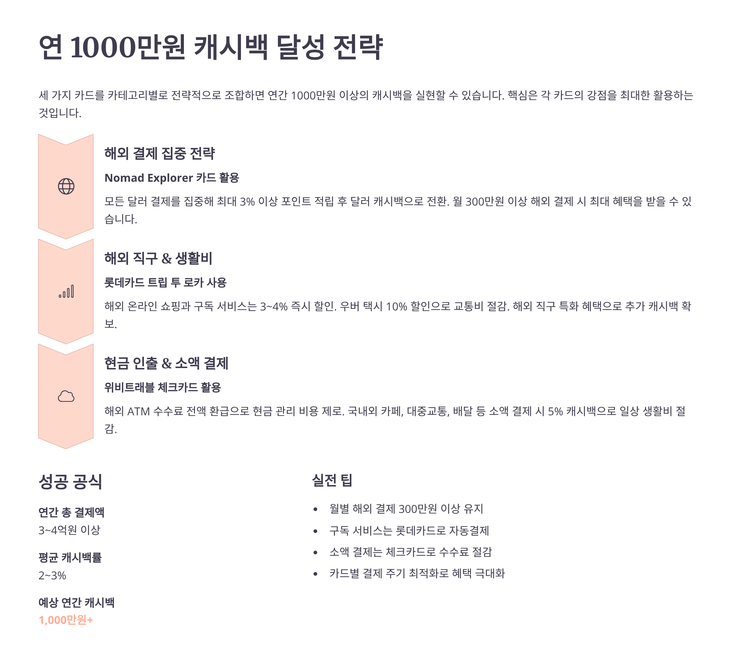 이 글에서 소개한 카드들을 잘 조합하면 정말 놀라운 혜택을 누릴 수 있어요! 연간 1000만원 캐시백은 전혀 불가능한 목표가 아니랍니다. 각 카드의 장점을 최대한 활용하고, 카테고리별로 전략적으로 사용하면 해외 생활 경비를 크게 절약할 수 있어요.