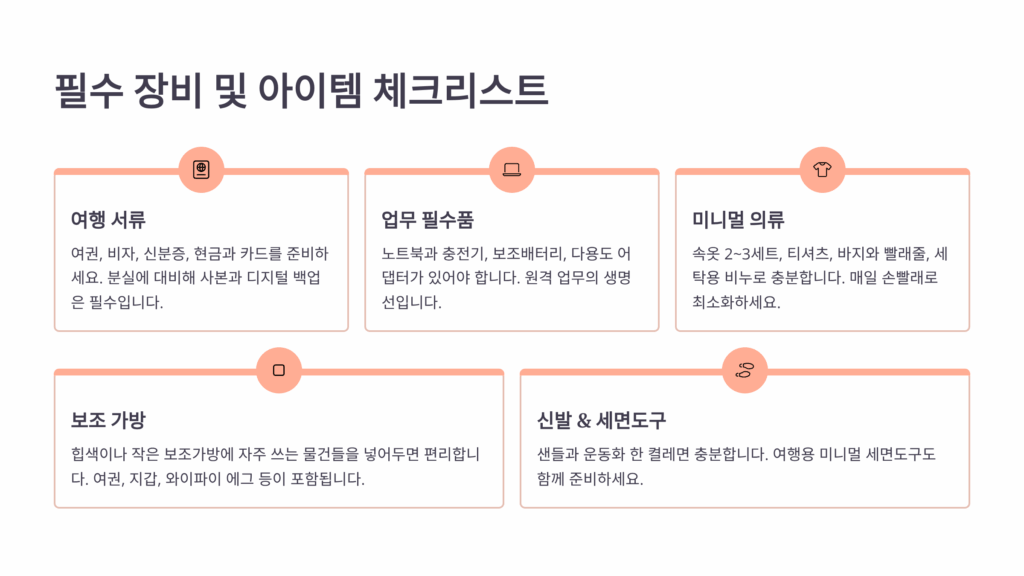 업무용 가방을 따로 준비하는 것도 좋은 방법이에요. 저는 접이식 노트북 가방을 하나 더 가지고 다녀요. 평소엔 메인 백팩 안에 넣어두고, 코워킹 스페이스나 카페에 갈 때만 꺼내서 사용해요. 노트북, 충전기, 노트, 펜, 명함 등 업무에 필요한 것들만 담아서 가볍게 이동할 수 있어요. 숙소에선 생활용품만 꺼내 쓰면 되니까 정리도 편해요.