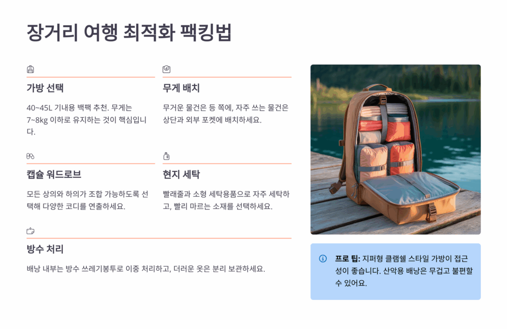 장거리 여행에서 가장 중요한 건 ‘레이어링 시스템’이에요. 백팩 안에 물건을 넣을 때는 무거운 것을 등 쪽에, 가벼운 것을 바깥쪽에 배치하는 게 기본이에요. 노트북과 책은 등판 가까이, 옷은 중간층, 세면도구와 작은 물건들은 외부 포켓에 넣으면 무게 분산이 잘 돼요. 이렇게 하면 장시간 백팩을 매고 있어도 허리와 어깨에 부담이 적어요.