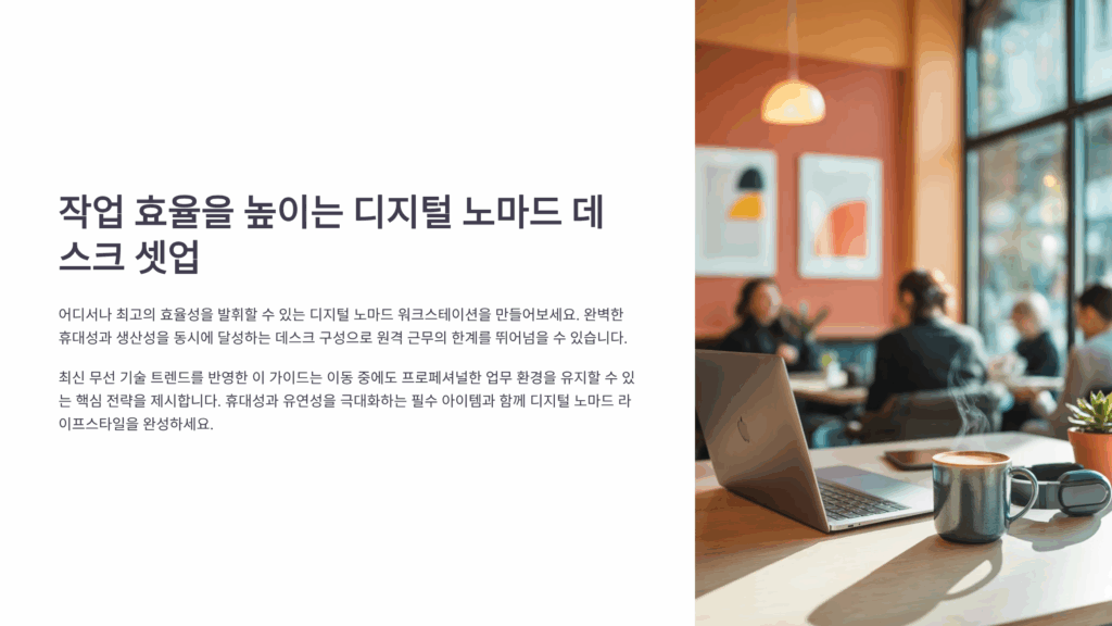 디지털 노마드로 살아가면서 어디서든 효율적으로 일할 수 있는 데스크 셋업은 정말 중요해요. 카페, 코워킹 스페이스, 숙소 등 다양한 환경에서 빠르게 업무 공간을 구성하는 노하우를 공유할게요. 실제로 3년간 노마드 생활을 하며 터득한 실전 팁들이랍니다! 🌍
