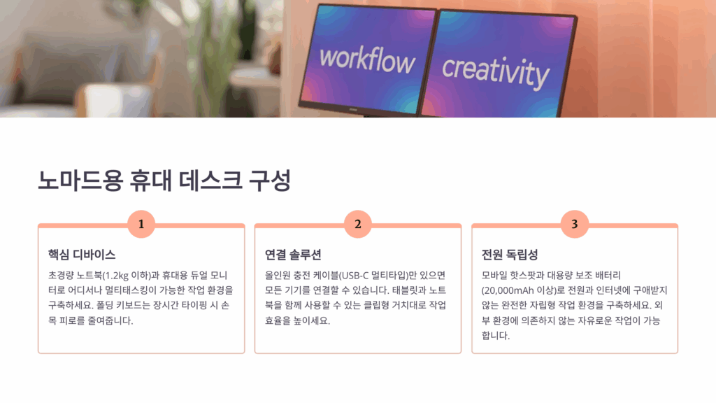 이동이 잦은 노마드 특성상 가볍고 실용적인 장비 선택이 핵심이에요. 무게와 부피를 최소화하면서도 업무 효율은 최대화할 수 있는 스마트한 셋업 방법을 알려드릴게요. 실제 사용 경험을 바탕으로 한 생생한 정보들을 담았답니다.