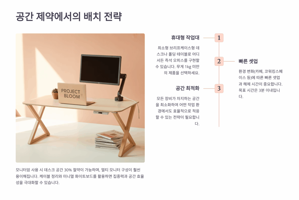 좁은 카페 테이블이나 호텔 책상에서도 효율적으로 일하려면 공간 활용 전략이 필요해요. 수직 공간을 최대한 활용하는 게 핵심이에요. 노트북을 스탠드에 올리고 아래 공간에 키보드를 배치하면 작업 공간이 30% 정도 넓어진답니다.