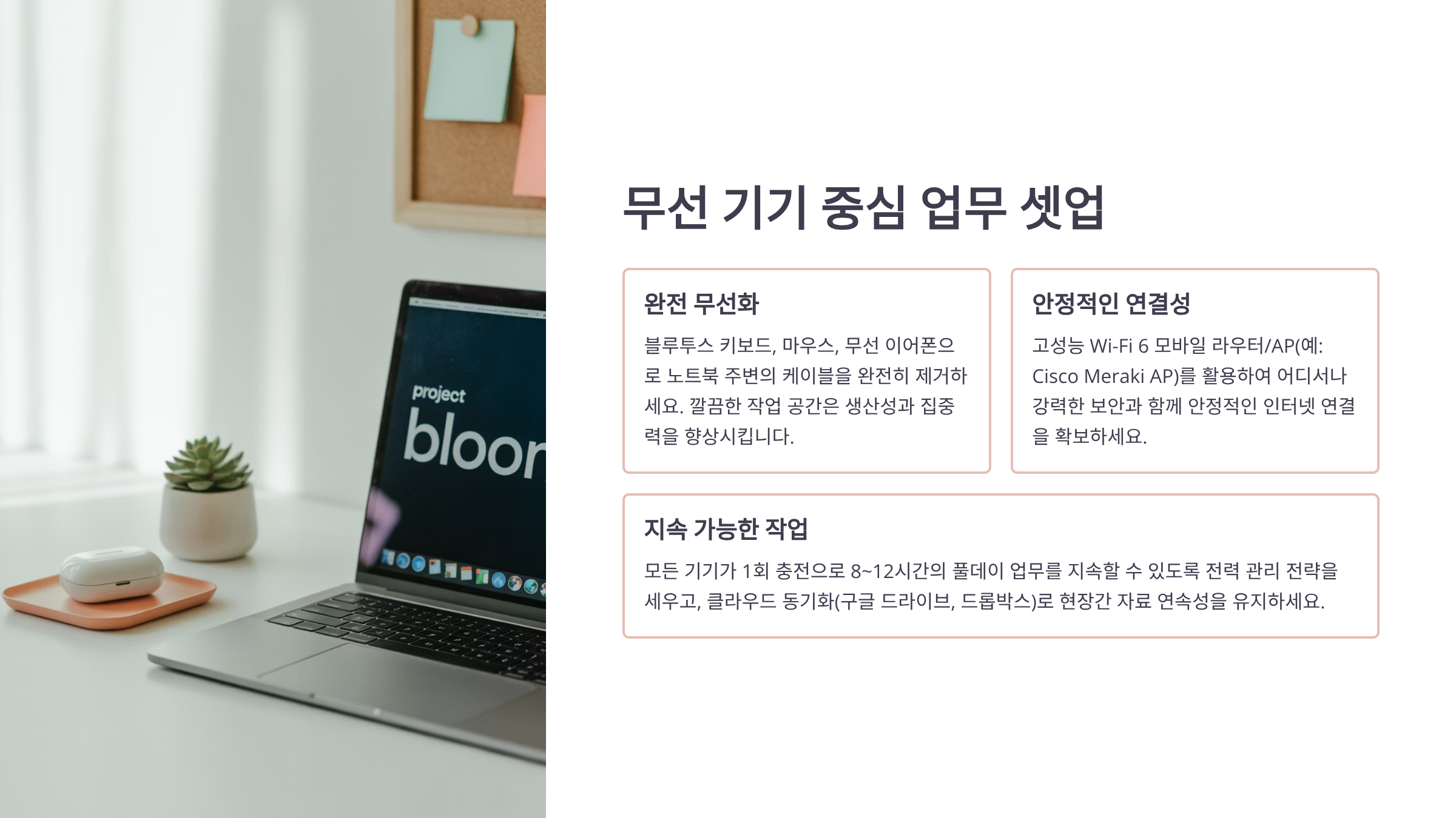 무선 기기 중심의 셋업은 노마드 생활의 자유도를 극대화해줘요. 블루투스 5.0 이상을 지원하는 기기들을 선택하면 연결이 안정적이고 배터리 효율도 좋아요. 멀티포인트 연결을 지원하는 제품이라면 여러 기기를 동시에 연결할 수 있어서 더욱 편리하답니다! 🎧