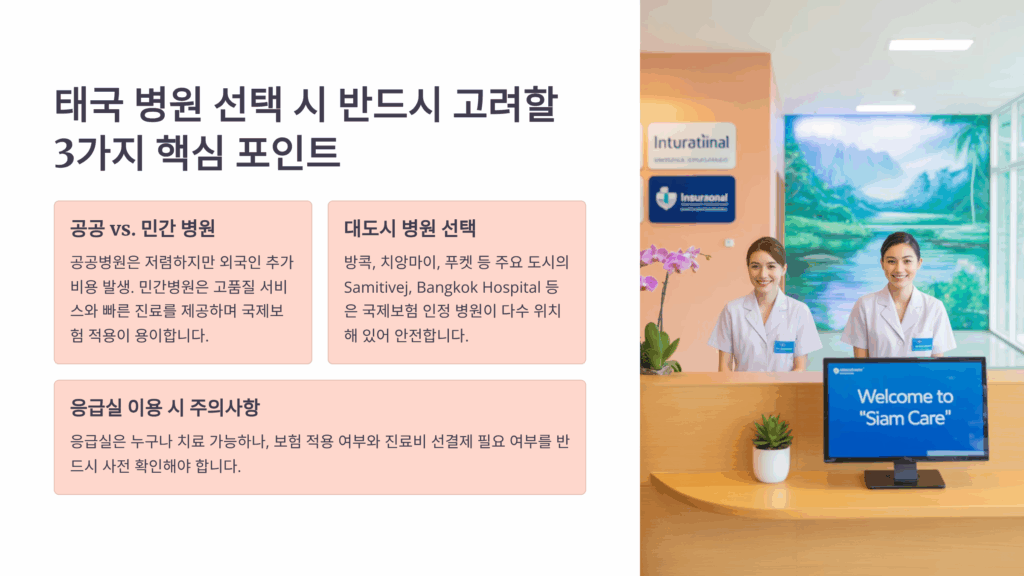 24시간 응급실 운영 여부도 확인하세요. 태국의 모든 병원이 24시간 응급실을 운영하는 건 아니에요. 특히 작은 클리닉이나 중소 병원은 야간 진료를 하지 않는 경우가 많답니다. 응급상황에 대비해 숙소 근처 24시간 병원을 미리 알아두는 게 좋아요.