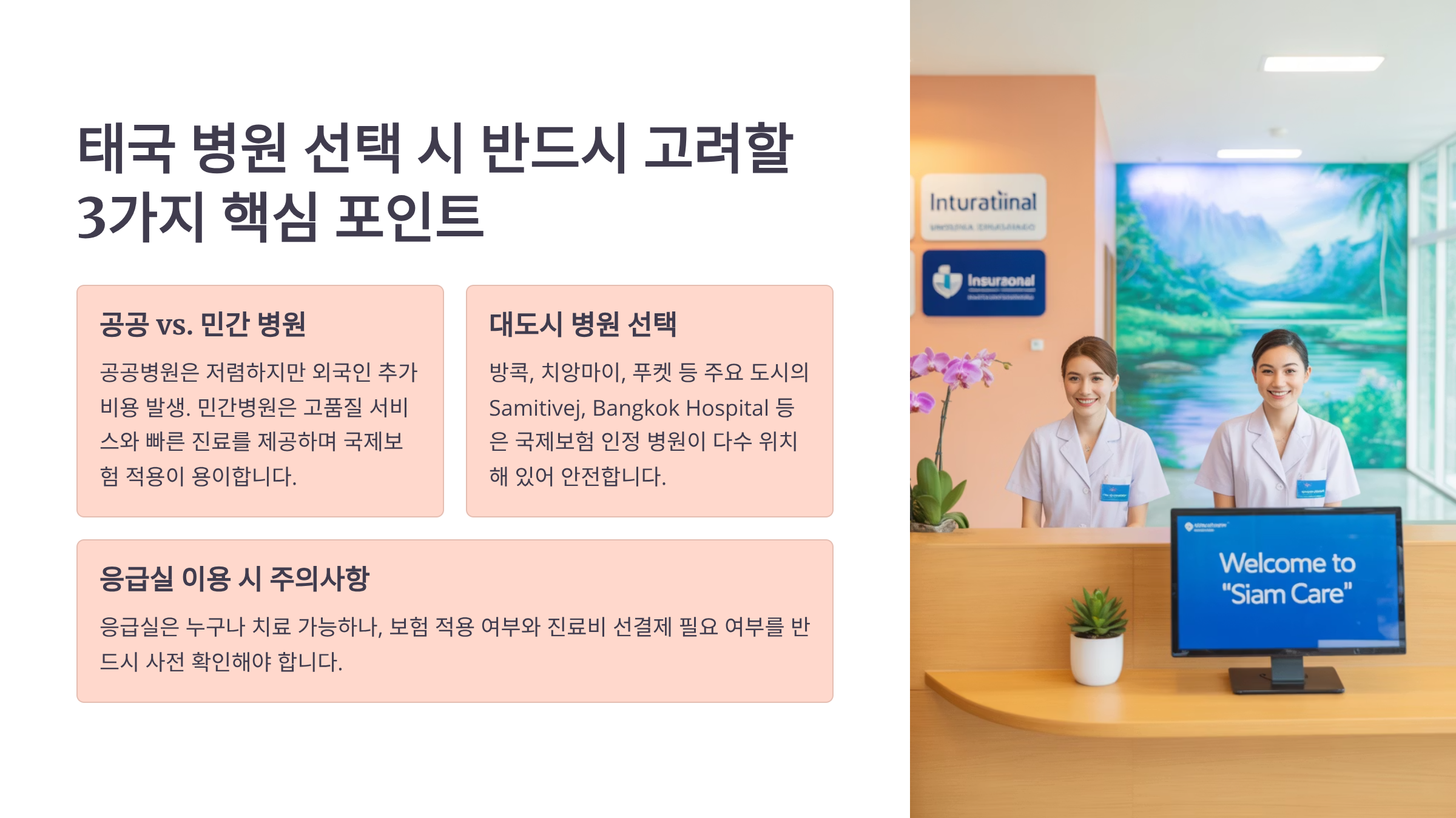 태국에서 병원을 선택할 때는 여러 가지를 고려해야 해요. 우선 국제인증을 받은 병원인지 확인하는 게 중요해요. JCI(Joint Commission International) 인증을 받은 병원들은 국제적 수준의 의료 서비스를 제공하고, 보험 처리도 원활하게 진행된답니다. 방콕의 범룽랏 병원, 사미티벳 병원, 방콕병원 등이 대표적이에요.