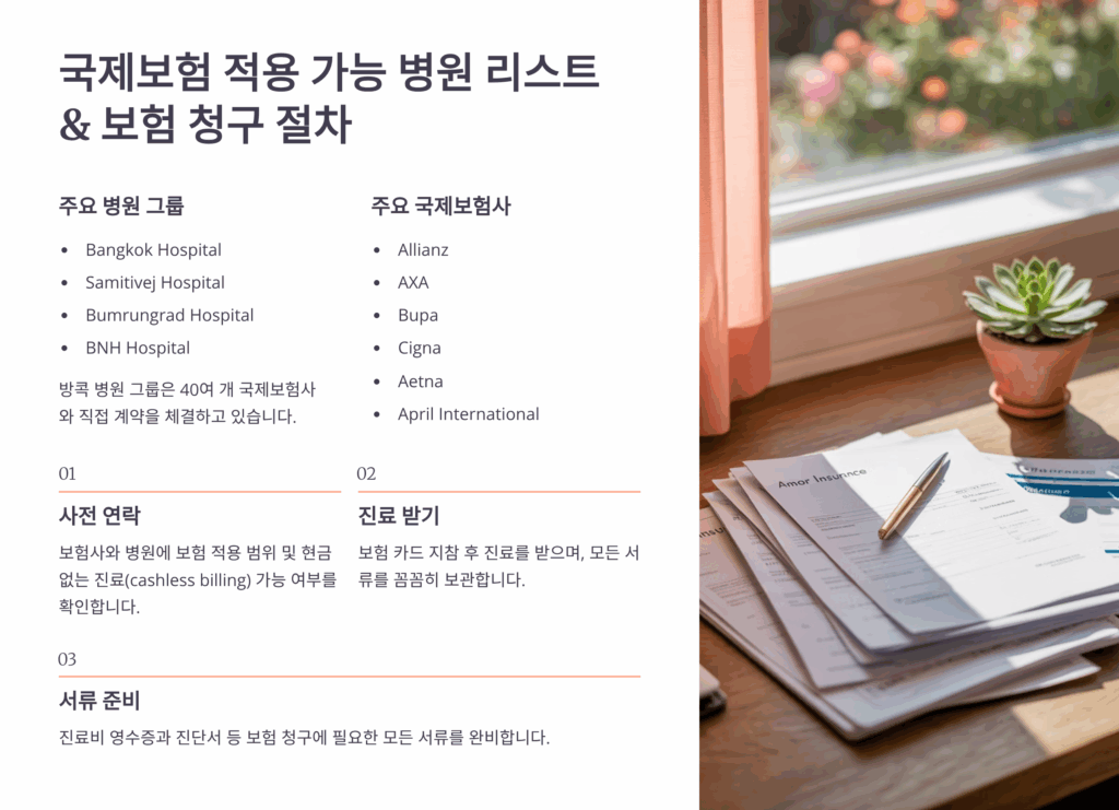 태국에서 국제보험이나 한국 실손보험을 적용받을 수 있는 병원들이 많이 있어요. 방콕을 중심으로 주요 도시별로 보험 처리가 원활한 병원들을 정리해드릴게요. 이 병원들은 대부분 영문 진단서와 영수증 발급이 가능하고, 보험 청구에 필요한 서류를 체계적으로 준비해준답니다.