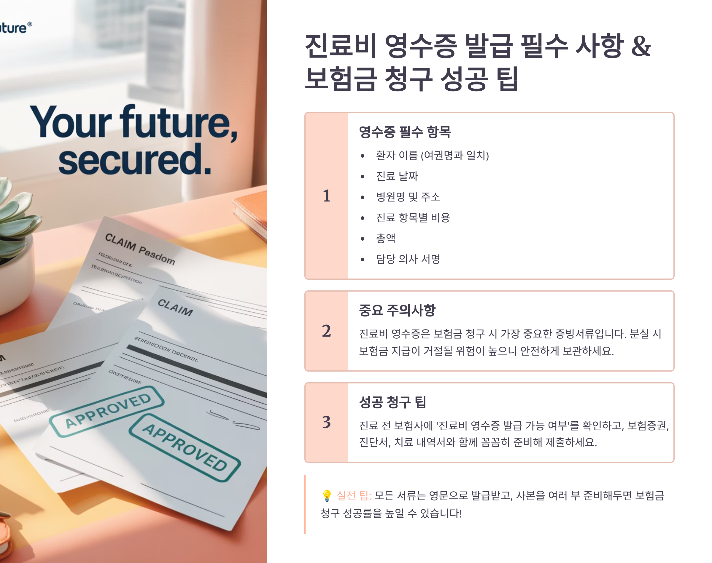 A21. 최소 요건만 충족하면 인정돼요. 병원명, 환자명, 진료일, 금액, 병원 도장이 있으면 기본적으로 인정돼요. 하지만 고액 청구 시에는 상세 내역을 요구할 수 있어요. 작은 병원이라도 “Detailed Receipt”를 요청하면 항목별로 작성해줘요. 진단명이 빠졌다면 의사에게 따로 메모라도 받으세요.