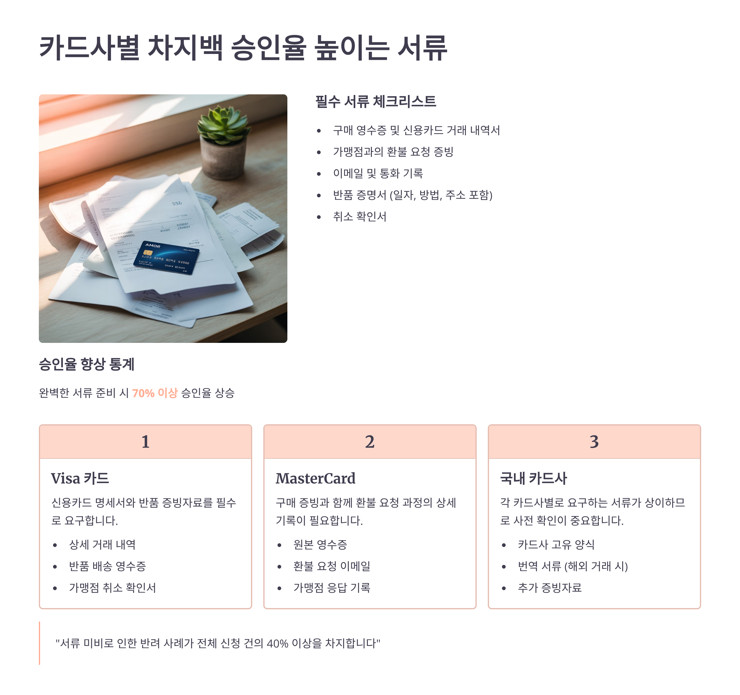 차지백 승인율을 높이려면 체계적인 서류 준비가 필수예요. 각 카드사마다 요구하는 서류가 조금씩 다르지만, 기본적으로 거래 내역서, 주문 확인서, 판매자와의 소통 내역, 상품 사진이나 영상 등이 필요해요. 비자(VISA)의 경우 ‘Dispute Transaction Form’을 작성해야 하고, 마스터카드는 ‘Chargeback Documentation Checklist’를 요구한답니다. 이런 서류들은 각 카드사 홈페이지에서 다운로드할 수 있어요.
